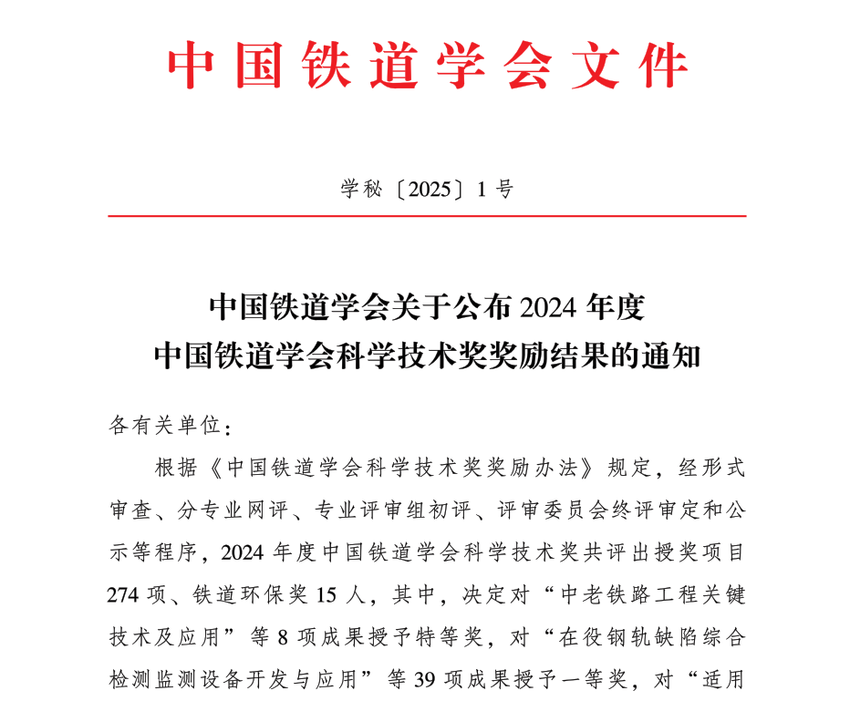 中國鐵道學會科學技術獎設立于2002年,旨在獎勵鐵道行業科技活動中做出突出貢獻的單位和個人,調動科技工作者的積極性,提高鐵路技術創新能力,加速鐵路現代化建設。中國鐵道學會科學技術獎作為鐵道行業最有影響、最具權威的科技獎項,見證了鐵道行業挑戰極限、勇創一流的科技輝煌,筑就了鐵路科技工作者勇攀高峰、敢為人先的精神豐碑。